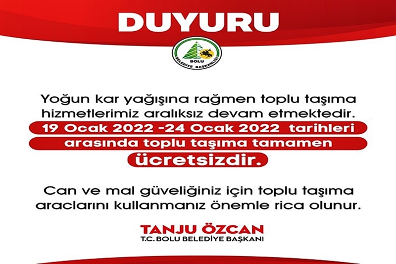 Konuyla ilgili yapılan açıklamada; “Yoğun kar yağışına rağmen ulaşım hizmetlerimiz devam etmektedir. Bolu Belediye Başkanı Sayın Tanju Özcan’ın talimatıyla 19 Ocak 2022-24 Ocak 2022 tarihleri arasında toplu taşıma tamamen ücretsiz olup vatandaşlarımızın mal ve can güvenliği için toplu taşıma araçlarını kullanmaları rica olunur” denildi.