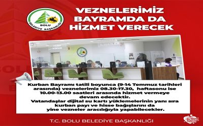 Bolu Belediyesi’nde vezneler 9 günlük Kurban Bayramı tatili boyunca vatandaşların mağduriyet yaşamaması için hizmet vermeye devam edecek. Vatandaşlar dijital su kartı yüklemelerinin yanı sıra kurban payı ve hisse bağışlarını da yine vezneler aracılığıyla yapabilecekler.