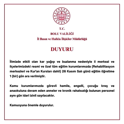“İlimizde etkili olan kar yağışı ve buzlanma nedeniyle, il merkezi ve ilçelerimizdeki resmi ve özel tüm eğitim kurumlarımızda (Rehabilitasyon merkezleri ve Kur-an Kursları dahil) 26 Kasım Salı günü eğitim öğretime 1 (bir) gün ara verilmiştir.