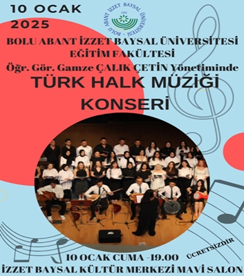 Bolu Abant İzzet Baysal Üniversitesi Eğitim Fakültesi Öğretim Görevlisi Gamze Çalık Çetin yönetiminde Türk Halk Müziği Konseri 10 Ocak 2025 Cuma akşamı saat: 19.00’da üniversitenin Mavi Salon’unda icra edilecek.