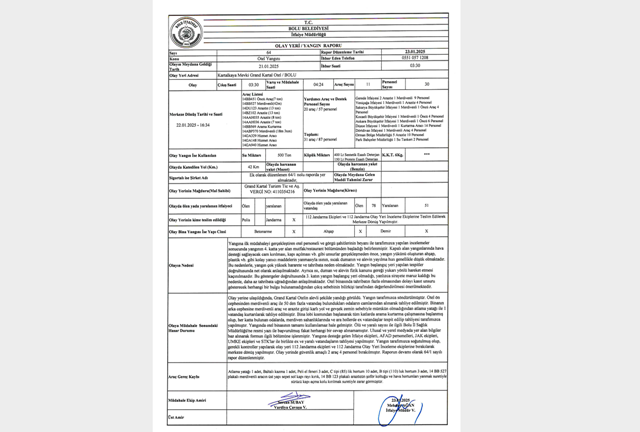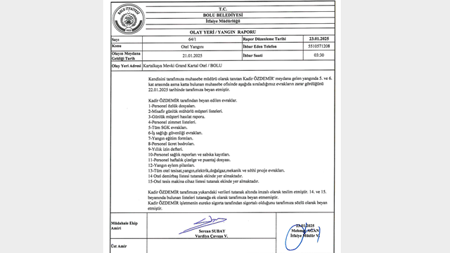 Kartalkaya Kayak Merkezi’ndeki Grand Kartal Otel’de 21 Ocak Salı günü 03.30’da çıkan ve 78 kişinin ölümüne sebep olan yangına ilişkin Bolu Belediyesi İtfaiye Müdürlüğünce hazırlanan olay yeri yangın raporu ortaya çıktı.