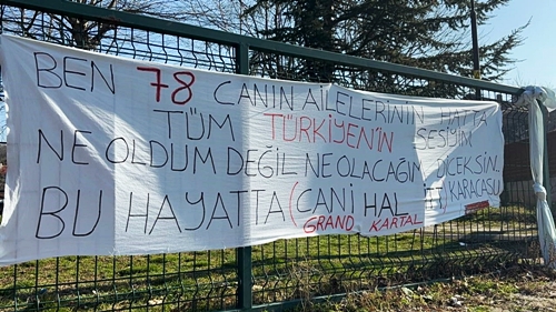 Halit Ergül’ün sahibi olduğu Gazelle Resort Otel’in giriş yolundaki parka, vatandaşlar tarafından “Ben 78 canın ailelerinin hatta tüm Türkiye’nin sesiyim. Ne oldum değil ne olacağım diyeceksin bu hayatta. Cani Halit” yazılı pankart asıldı.