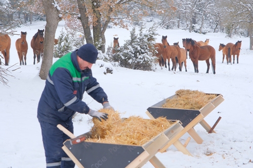 Doğal yaşamın korunması amacıyla yürütülen çalışmayla yılkı atları, bırakılan samanları yiyerek karınlarını doyurdu.
