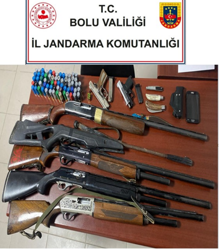 Bolu İl Jandarma Komutanlığınca, yapılan aramalarda 2 Adet 9 mm. Tabanca, 1 Adet 7,65 mm tabanca, 5 Adet Av Tüfeği, 5 Adet Kurusıkı Tabanca Fişeği, (1) Adet 9 mm Fişek, 68 Adet Av Tüfeği Fişeği, 1 Adet Kama Bıçak, 1 Adet Cep Telefonu ele geçirilmiştir. “6136 S.K.M.” suçunu işleyen M.A. ve O.S isimli şahıslar yakalanarak adli makamlara sevkleri sağlanmıştır.