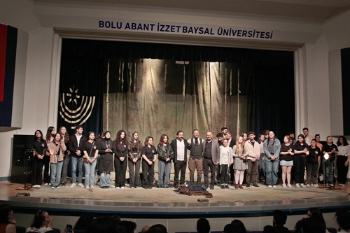 Ardından sahneye davet edilen BAİBÜ Yaratıcı Drama Topluluğu ile Bolu Bölge Tiyatrosu oyuncularıyla hep birlikte fotoğraf çektirerek bu anı ölümsüzleştirdiler.