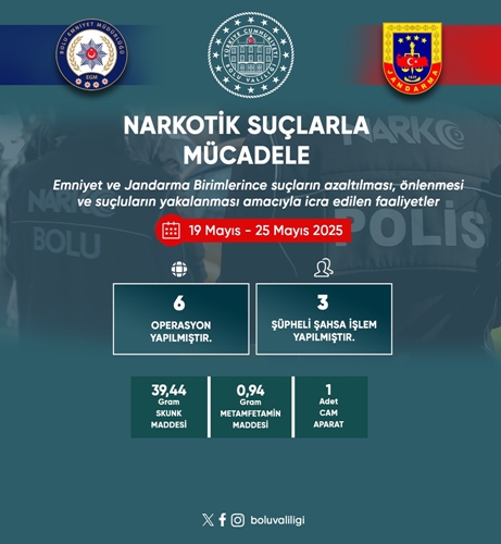 Bolu’da İl Emniyet Müdürlüğü ve İl Jandarma Komutanlığı ekipleri tarafından, 19-25 Mayıs 2025 tarihleri arasında gerçekleştirilen Narkotik Suçlarla Mücadele kapsamında, 6 operasyon sonucu 3 şüpheli şahsa yasal işlem yapıldı.