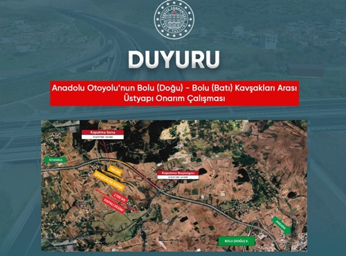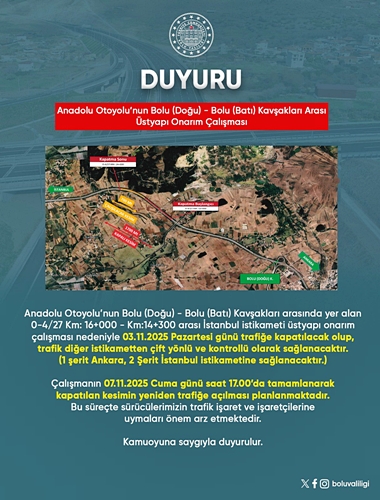 “Anadolu Otoyolu’nun Bolu (Doğu) ve Bolu (Batı) kavşakları arasında yer alan 0-4/27 Km: 16+000-  Km: 14+300 arası İstanbul istikameti üstyapı çalışması nedeniyle 03.11.2025 Pazartesi günü trafiğe kapatılacak. Trafik diğer istikametten çift yönlü ve kontrollü olarak sağlanacak. (1 şerit Ankara, 2 şerit İstanbul istikametine sağlanacaktır.)