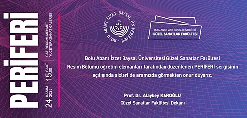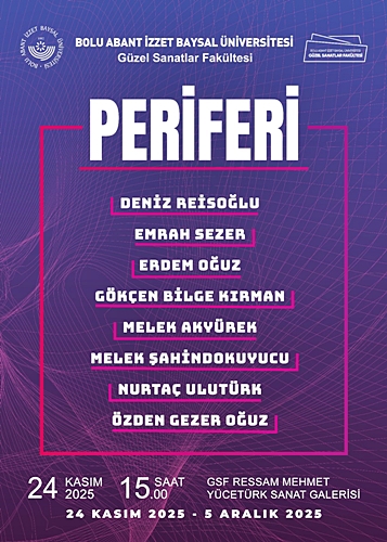Bolu Abant İzzet Baysal Üniversitesi Güzel Sanatlar Fakültesi Resim Bölümü öğretim üyeleri tarafından düzenlenen “PERİFERİ” adlı karma sergi, 24 Kasım 2025 Pazartesi günü saat 15.00’te GSF Ressam Mehmet Yücetürk Sanat Galerisi’nde açılışı gerçekleşecek.