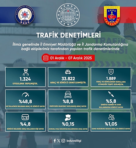 Bolu İl Emniyet Müdürlüğü ve İl Jandarma Komutanlığına bağlı ekiplerimiz tarafından 01-07 Aralık 2025 tarihleri arasında gerçekleştirilen trafik denetimleri sonucunda, 1.889 araç ve sürücüsünün kurallara uymadığı tespit edildi.