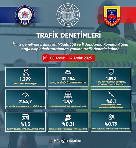 Bolu İl Emniyet Müdürlüğü ve Bolu İl Jandarma Komutanlığına bağlı ekipler tarafından 08-14 Aralık 2025 tarihleri arasında gerçekleştirilen trafik denetimleri sonucu;