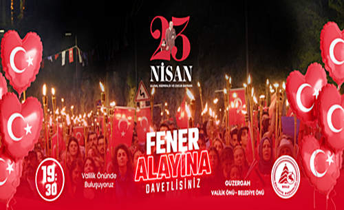 23 Nisan Ulusal Egemenlik ve Çocuk Bayramı kutlamaları kapsamında Bolu Belediyesi tarafından Fener Alayı yürüyüşü düzenlenecek. 23 Nisan Perşembe günü saat 19.30’da valilik önünden start alacak yürüyüşte, Bolulular, Belediye Bandosu eşliğinde Fener Alayı Yürüyüşü gerçekleştirecek. Meşaleler ve Türk bayrakları eşliğinde İzzet Baysal Caddesi boyunca sürecek yürüyüş, belediye önünde son bulacak.