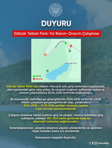 “Gölcük Tabiat Parkı’nda (Seben- Kıbrıscık yolu giriş kısmında başlayarak), alan içerisindeki giriş- çıkış yolları ile otopark bağlantı yollarında bakım ve onarım çalışmalarına 20.04.2026 tarihinde başlanmıştır.
