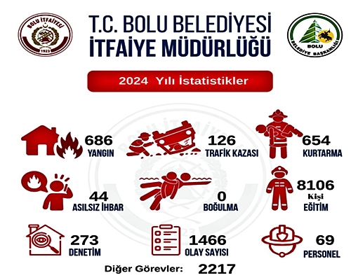 DevamRakamlarla Bolu İtfaiyesi’nin 2024 yılı Bolu Belediyesi İtfaiye Müdürlüğü, 2024 yılında 1466 olaya müdahale ederek Boluluların en zor anlarında yanlarında