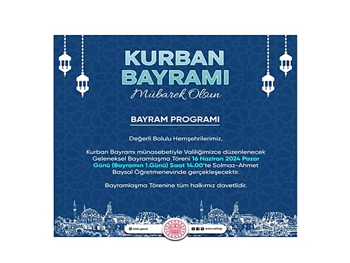 DevamBolu Valiliği’nden yapılan paylaşımda, Kurban Bayramı münasebetiyle Bolu Valiliğince düzenlenecek olan “Geleneksel Bayramlaşma Töreni” 16 Haziran 2024 Pazar günü (Bayramın